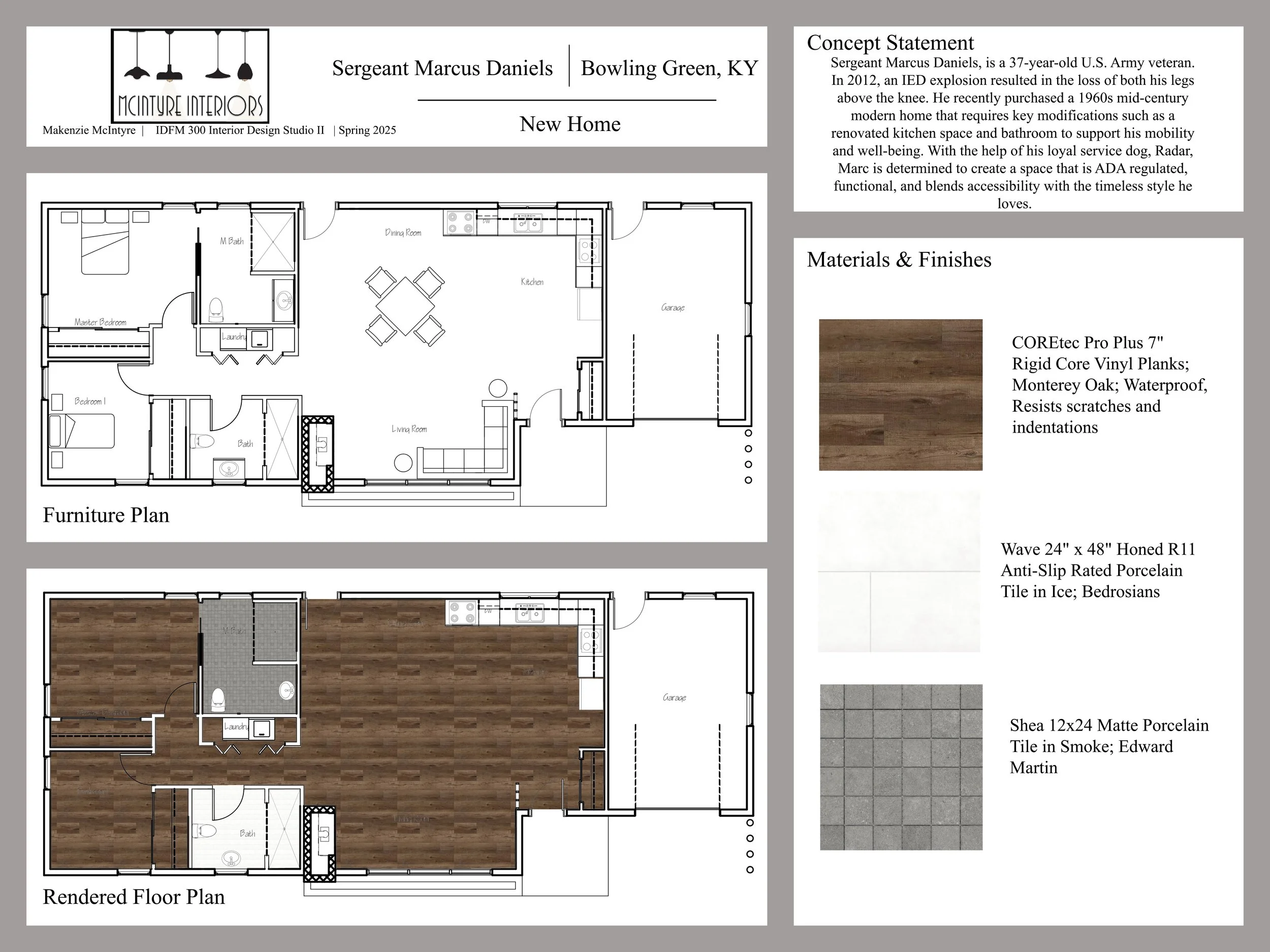 This project showcases my ability to design with accessibility at the forefront, adhering to ADA guidelines to create a safe and functional home for a disabled veteran. Working from an existing residential shell, I developed a comprehensive demolition plan and reconfigured the layout to support the veterans daily living needs. This project highlights my understanding of universal design principles and my commitment to creating spaces that prioritize safety, comfort, and inclusivity.