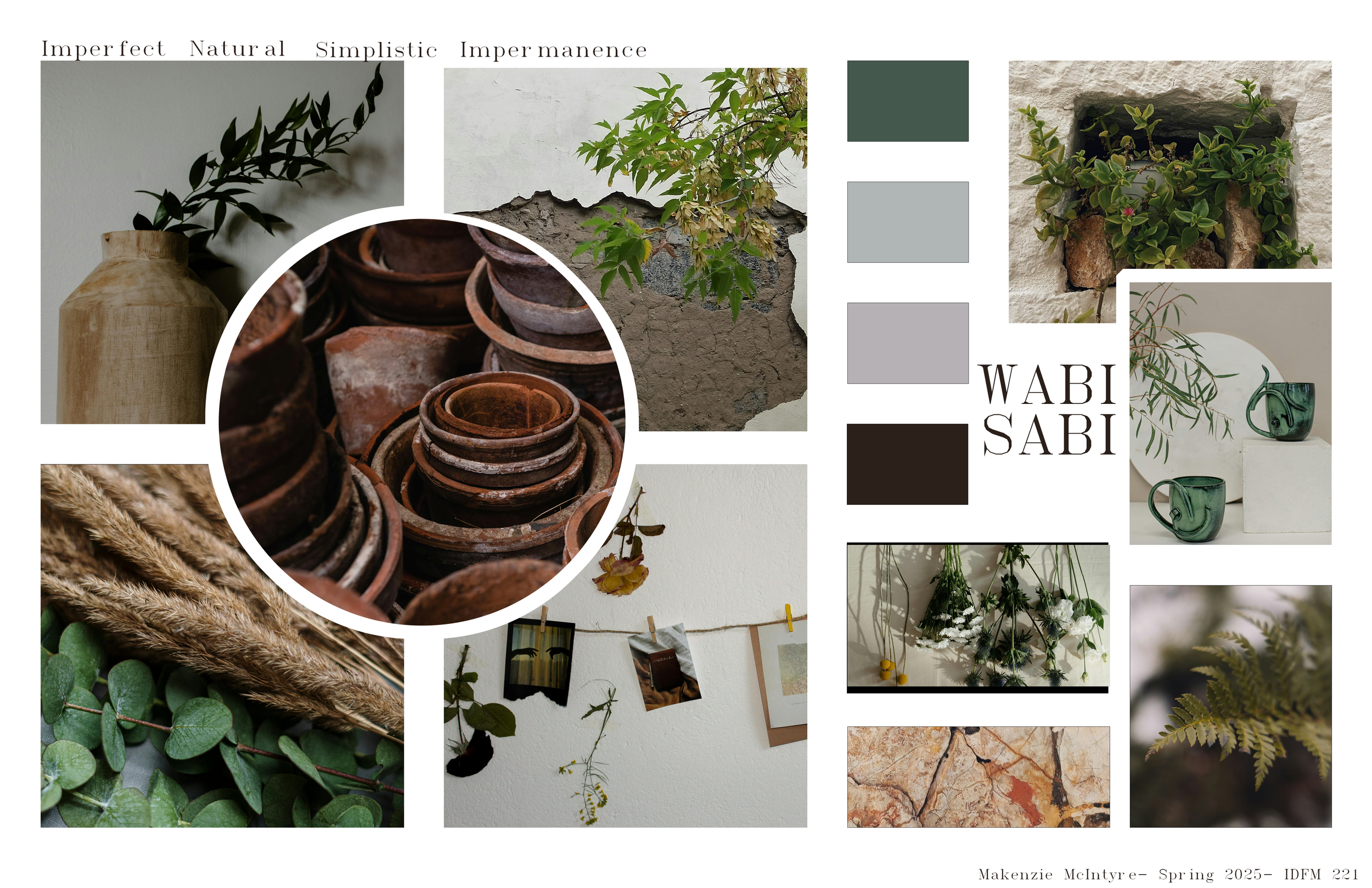 We were tasked with developing a board centered on the Japanese aesthetic of Wabi-Sabi. The concept embraces imperfection and impermanence through a muted palette, natural materials, and organic textures. The overall design reflects balance and the quiet elegance of the imperfect.